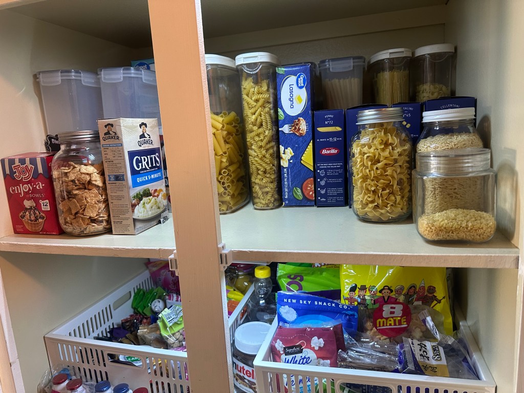 As for the rest of the kitchen, I keep what I call my “everyday pantry”—pasta, cereal, school snacks, lunch and bento boxes, water bottles, even the dog food and treats. Then there’s the second pantry in the laundry room, where I tuck away all the “magic ingredients” I rely on when it’s time to pull dinner together.