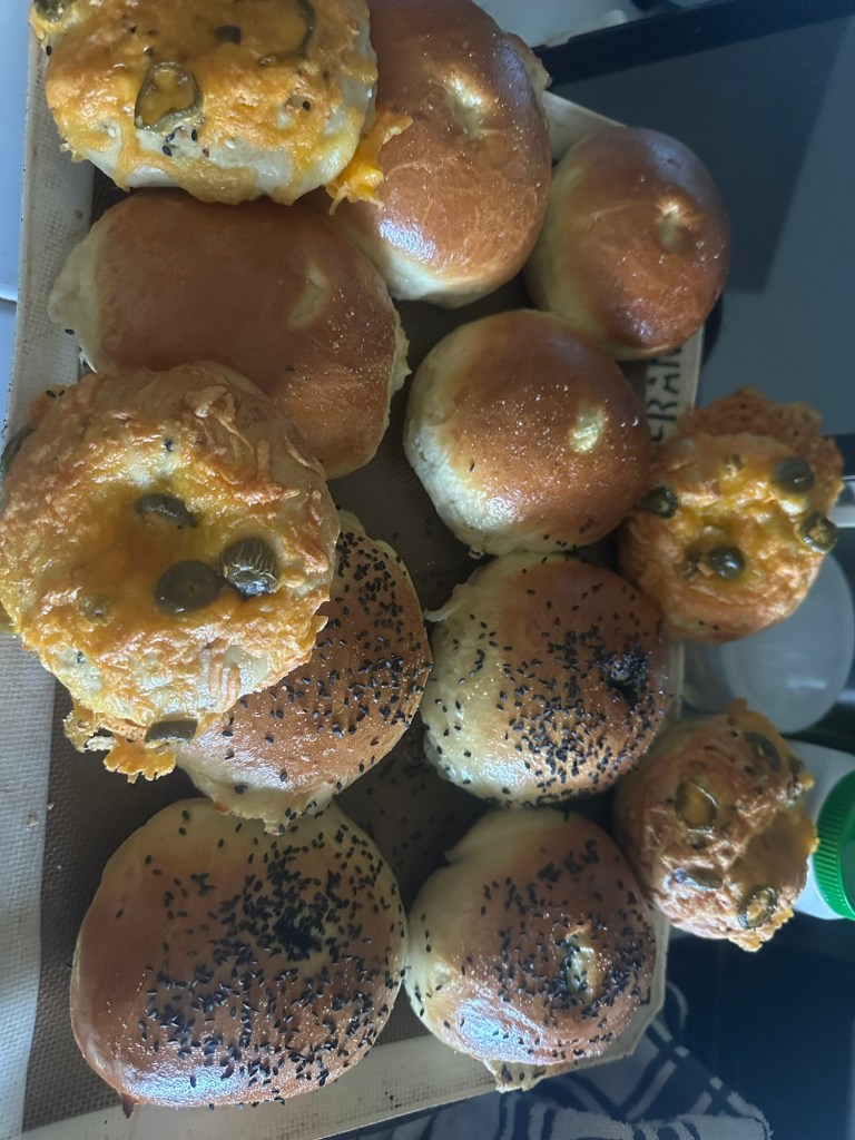 🥯 Fresh bagels — cheddar, everything, and egg (that look more like bialis, but hey 😂)